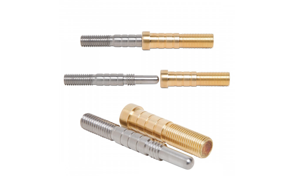 Посадка соединения в кий осуществляется при помощи резьбы (мама М10, шаг 1; папа М8, шаг 1,25). Центровка в древесине происходит за счет направляющих перед резьбой и держится за счет клеевых канавок и резьбы.